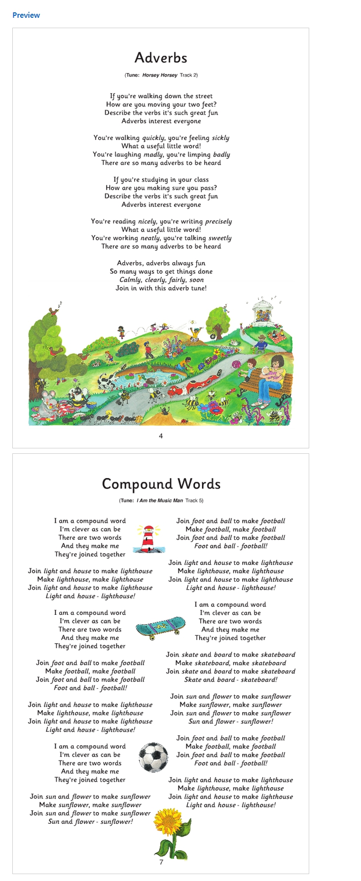 Grammar Songs are a fun and interactive resource for teaching children the basic rules of grammar, spelling and punctuation that are covered in Grammar 1 and 2. The book comes with an audio CD with 20 songs that are set to popular tunes and sung in British English. The lyrics are fun and the tunes familiar and upbeat, making the songs catchy and memorable. Children can sing along using the lyrics provided and very quickly learn the songs, enabling them to recall numerous grammatical facts and rules. Games and activities are also included in the 24 page book.