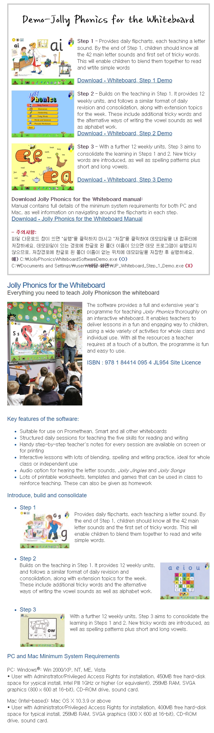 The software provides a full and extensive year's programme for teaching Jolly Phonics thoroughly on an interactive whiteboard. It enables teachers to deliver lessons in a fun and engaging way to children, using a wide variety of activities for whole class and individual use. With all the resources a teacher requires at a touch of a button, the programme is fun and easy to use.